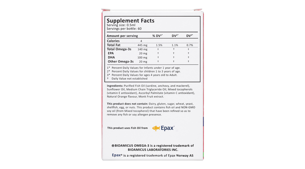 Nếu để ý, mẹ có thể thấy dòng chữ "Omega-3 DHA + EPA Triglyceride Form" trên bao bì nhập khẩu nguyên hộp từ Canada. Dòng chữ này khẳng định Omega-3 (bao gồm DHA và EPA) BioAmicus ở dạng Triglyceride - Dạng dùng cho khả năng hấp thu tốt hơn tới 150% so với dạng Ethyl Este phổ biến trên thị trường.