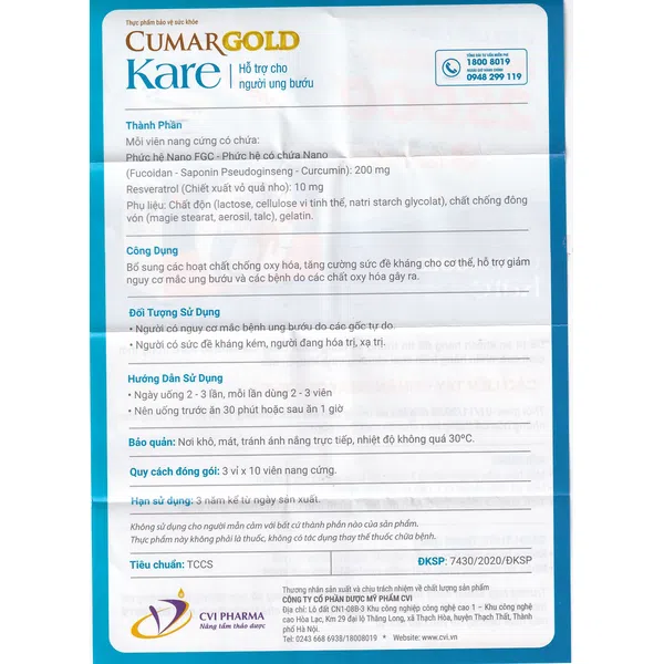 Cumargold Kare là thực phẩm bảo vệ sức khỏe hỗ trợ tăng cường miễn dịch và nâng cao thể trạng, giảm mệt mỏi đồng thời hỗ trợ giảm tác dụng phụ của hóa xạ trị. Cumargold Kare là sản phẩm duy nhất được Unesco vinh danh và Bộ Khoa Học Công Nghệ cấp bằng sáng chế.