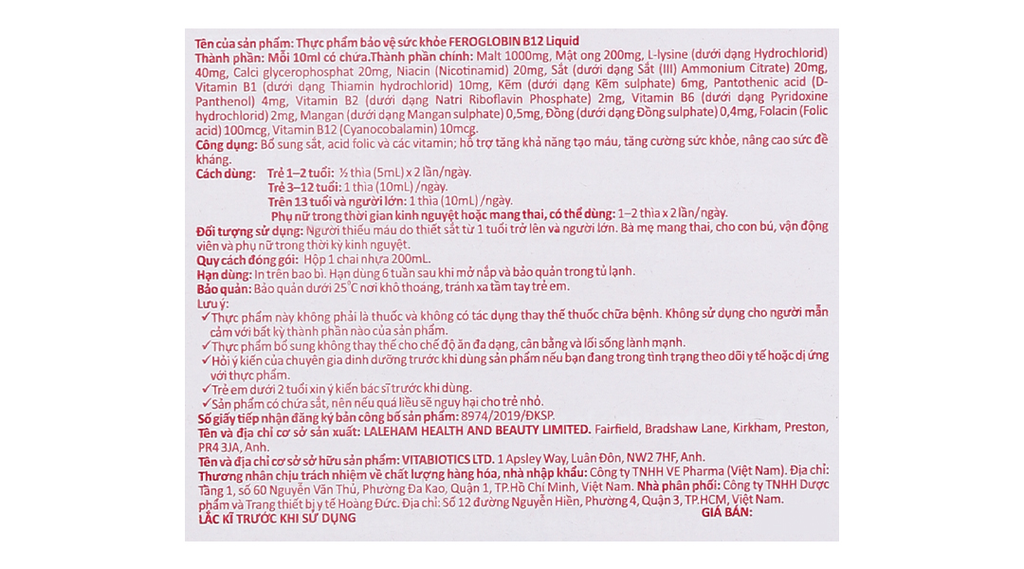 Malt 1000mg, Mật ong 200mg, L-lysine (Hydrochlorid) 40mg, Calci Glycerolphosphate 20mg, Niacin (Nicotinamid) 20mg, Sắt (Sắt (III) Amomonium Citrate), Vitamin B1 (Thiamin hydrochlorid) 10mg, Kẽm (Kẽm sulphate) 6mg, Pantothenic acid (D-Panthenol) 4mg, Vitamin B2 (Natri Riboflavin Phosphate) 2mg, Vitamin B6 (Pyridoxine hydrochloride) 2mg, Mangan (Mangan sulphate) 0,5mg, Đồng (Đồng sulphate) 0,4mg, Folacin (Folic acid) 100 μg, Vitamin B12 (Cyanocobalamin) 10 μg.