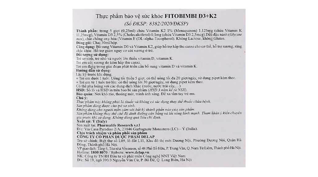 Trong 5 giọt (0,25ml) Fitobimbi D3+K2 chứa: