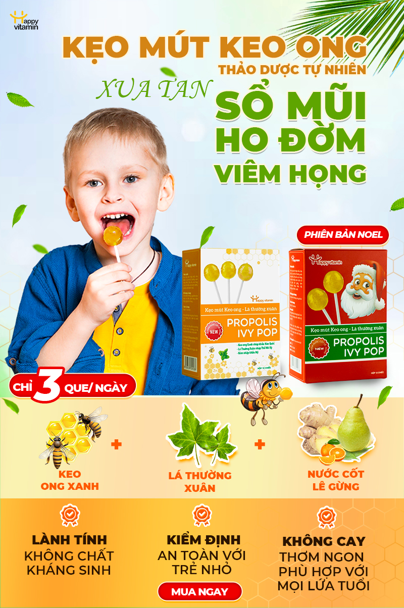 Kẹo mút keo ong lá thường xuân là một giải pháp toàn diện cho các cha mẹ trong việc ngăn ngừa các loại bệnh về đường hô hấp, làm trơn phế quản, thanh mát niêm mạc họng, giúp trẻ dịu cơn ho,.. Ngoài ra, dựa theo sở thích của trẻ đối với các loại kẹo đặc biệt là kẹo mút với hương cam dễ dùng cũng làm cho các cha mẹ không còn lo lắng trong việc con mình không chịu uống thuốc.
