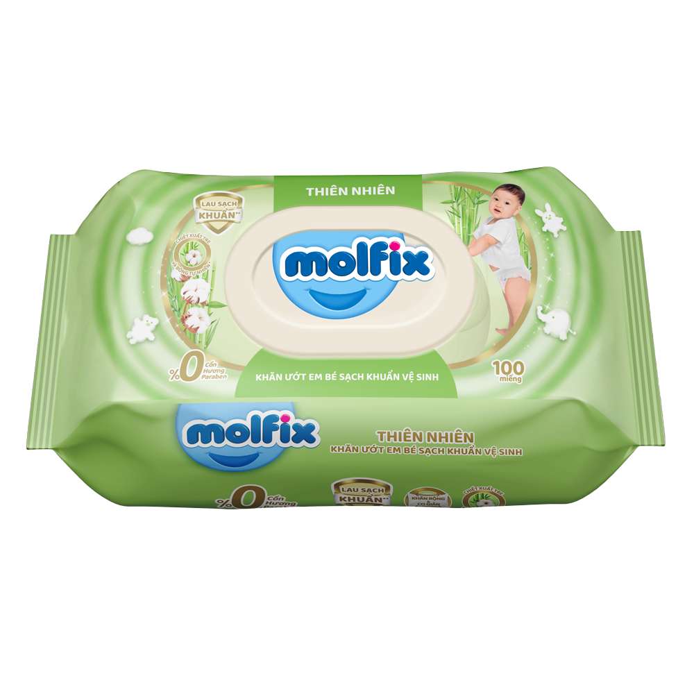 - Khăn ướt Molfix sạch khuẩn vệ sinh không mùi gói 100 miếng được sản xuất từ chất liệu an toàn, chiết xuất từ tre và bông tự nhiên loại bỏ 99% vi khuẩn, làm sạch da cho bé.