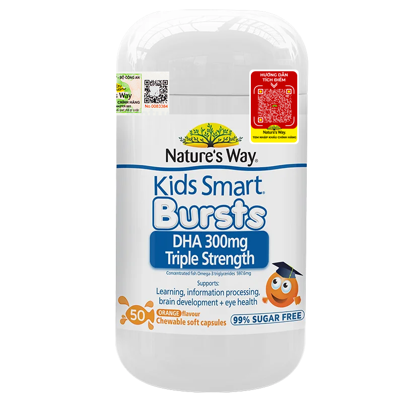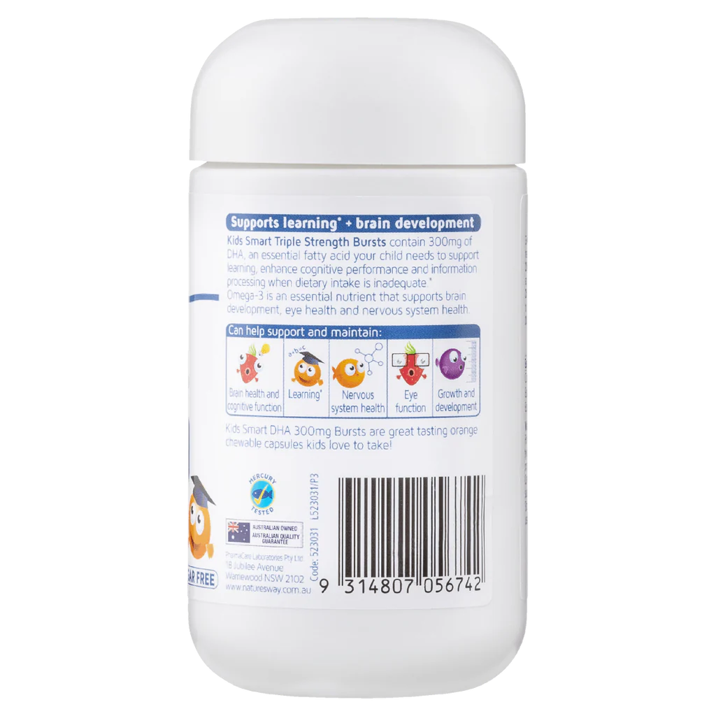Chất béo tốt từ cá là nguồn cung cấp tốt nhất cho não bộ. Nhưng việc ăn cá quanh năm để đáp ứng đủ nhu cầu cần thiết có thể không được ưa chuộng đối với trẻ nhỏ. Do đó, thực phẩm bổ sung là một sự thay thế hợp lý. Nature's Way Kids Smart DHA 300mg Triple Strength chứa dầu cá omega-3 DHA có thể giúp phát triển trí não và rất tốt cho trẻ không ăn đủ cá.