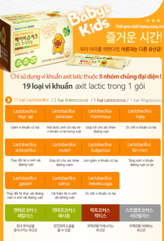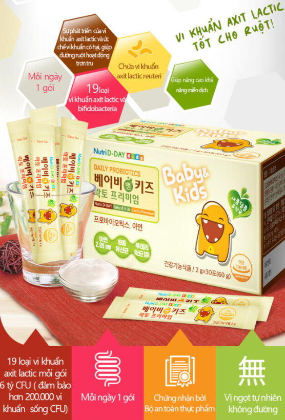 - Probiotics [6 tỷ lợi khuẩn đảm bảo 200 triệu CFU sống khi đến đích / Hỗn hợp Lactobacillus (Bifidobacteria lactis, Lactobacillus plantarum, Bifidobacteria longum, Lactobacillus rhamnosus, Bifidobacteria Bifidum, Bifidobacteria breve, Lactobacillus bulgaricus, Lactobacillus helveticus, Lactobacillus reuteri, Lactobacillus fermentum, Lactobacillus acidophilus, Lactobacillus paracasei, Lactobacillus casei, Lactobacillussalrius, Lactobacillus gasseri, Enterococcus Faecium, Enterococcus faecalis, Lactococcus lactis, Streptococcus thermophilus), dextrin, bột tinh thể glucose, bột hỗn hợp kem thực vật]: 30mg