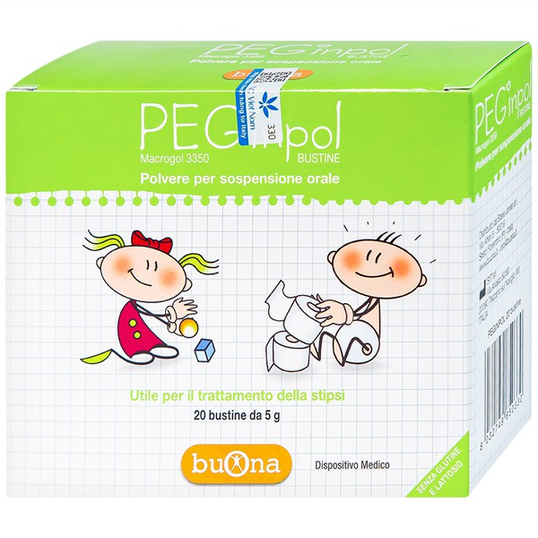 Khi gặp tình trạng táo bón, trẻ có thể bị rách hậu môn, đau đớn, quấy khóc,... khiến phụ huynh không khỏi lo lắng. Hiểu được điều đó, thương hiệu Buona đã nghiên cứu và thực hiện qua nhiều thử nghiệm với sản phẩm bột nhuận tràng trị táo bón PEGinpol. Bột nhuận tràng Peginpol Macrogol chứa PolyEthylene Glycol 3350 (PEG 3350 hay Macrogol 3350) dạng bột pha hỗn dịch. Được Hiệp Hội Nhi khoa, Tiêu hóa, Gan và Dinh dưỡng Châu Âu, Châu Mỹ và Viện chăm sóc sức khỏe NICE – UK khuyến nghị là lựa chọn đầu tay trong điều trị táo bón chức năng ở trẻ em nhờ hiệu quả, an toàn và dễ sử dụng.