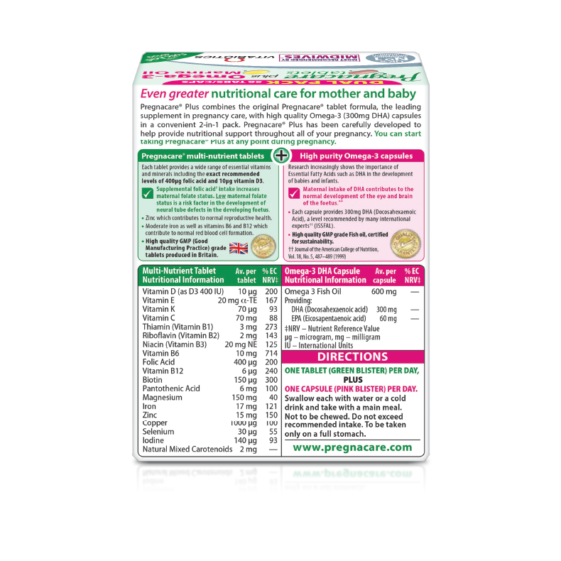 Uống 2 viên/ngày (1 viên nén vỉ màu xanh + 1 viên nang vỉ màu hồng), sau ăn, từ khi bắt đầu mang thai và trong suốt thời kì cho con bú.