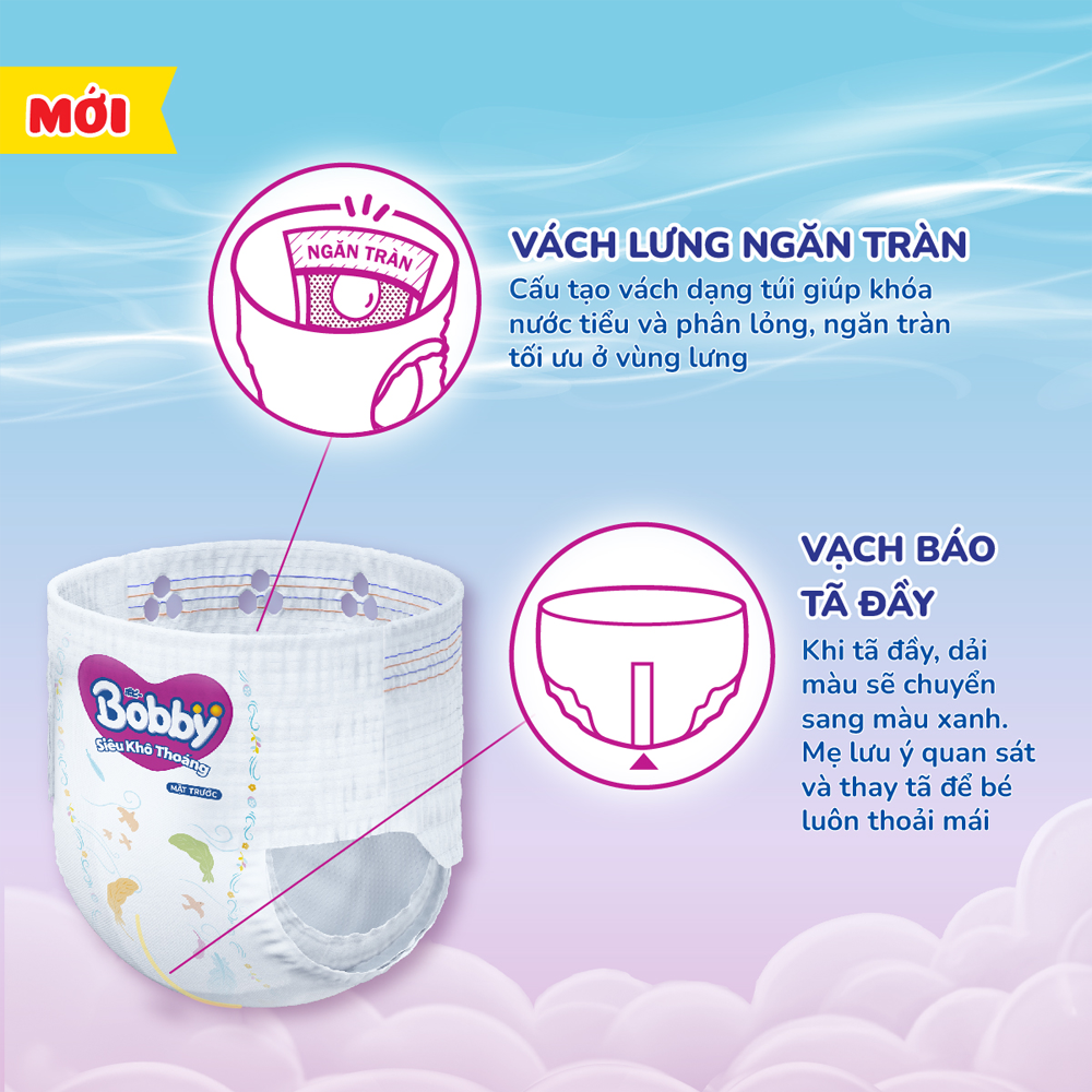Cấu tạo bề mặt đột phá với hơn 3.000 lỗ thấm hút siêu nhanh cho tã thoáng khí hơn gấp 2 lần, tã mỏng, luôn khô thoáng từ trong ra ngoài, không vón cục, ngăn tràn tối ưu.