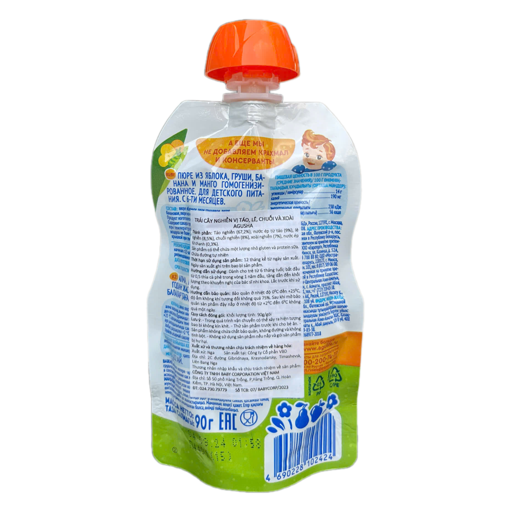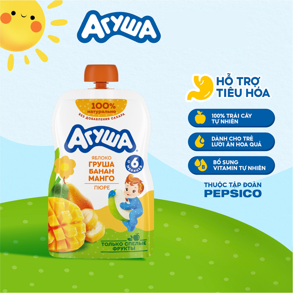 Trái cây nghiền cho bé Agusha vị vị táo, lê, chuối và xoài. Các loại hoa quả chứa protein và chất xơ, giúp cải thiện tiêu hóa và bài tiết các chất độc hại. Đặc biệt trong sản phẩm có chứa kali và protein có tính kháng khuẩn kháng viruts và các chất cần thiết cho trái tim bé khỏe mạnh hơn, giúp phát triển hệ thần kinh cũng như giúp sự trao đổi chất trong bé diễn ra tốt hơn